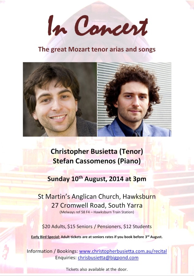 Award-winning singer Christopher Busietta, currently a full-time tenor soloist in Germany with Theater Augsburg, returns briefly to Melbourne between seasons to perform a 60-minute recital with award winning pianist, composer and chamber musician Stefan Cassomenos.